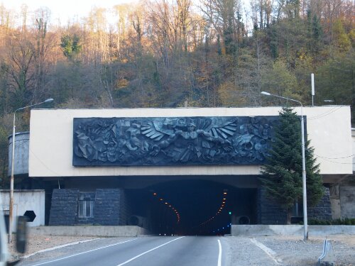Also the Georgian scenery was beautiful as we wound through a very long valley following a river, we barely noticed we had reached 500m of altitude it was so gradual. Then we hit the climb proper and had a fairly gruelling push up to 850m where we were presented with a choice. A tunnel with the scariest looking mouth I have seen – it looks like the angel of death beckoning you in, or a 4.5km bypass which would take us up to about 1400m. Rubina and I didn’t really need to discuss it, we headed into the tunnel! Which while being well lit was still pretty scary as it only had two lanes for both directions…we found some energy somewhere and pushed through quite quickly avoiding being knocked off by lorries quite narrowly sometimes!