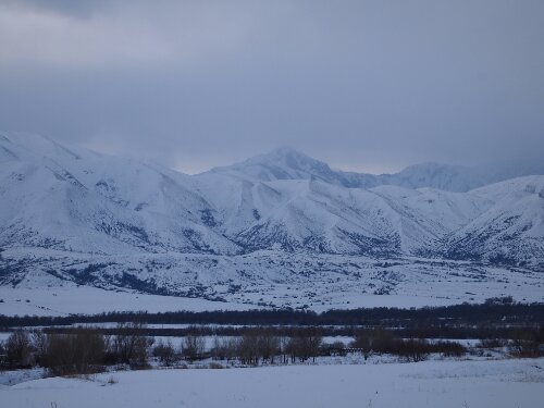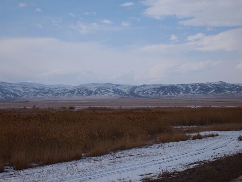 I headed out as early as possible the next day as I was expecting a tough ride. The road out of Shymkent hadn’t been great and I didn’t see any reason for it not to continue in the same vein. As usual I was wrong and about 15kms into my day’s ride the road suddenly became perfect. Beautiful smooth tarmac coupled with a slight downward gradient and even a tailwind! I felt like I was flying along. The only problem was that every so often the highway would become icy and I’d have to slow down. Luckily I only came off once and even more luckily that ice didn’t last and soon I was able to ride unhindered. There were beautiful views: