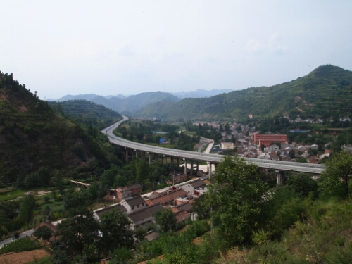 Leaving the highway we finally joined the 310 which was thankfully in good condition and began riding on this down to Baoji the next big city before Xi’an. The road was pretty impressive itself winding down and round a lot of hills but all the while the highway was above or to the side punching through mountains or bridging valleys.