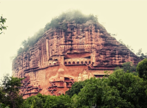 The next morning we woke bright and early and headed up to see the grottoes of Maiji Shan. For me these are easily the most amazing things I have seen in China thus far. Maiji Shan itself is an unusual looking mountain rearing up out of the ground like the haystack it is named for. It is is not its shape that draws people to visit, it is the hundreds of caves of varying sizes carved into the its sheer cliff faces.