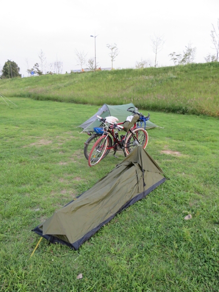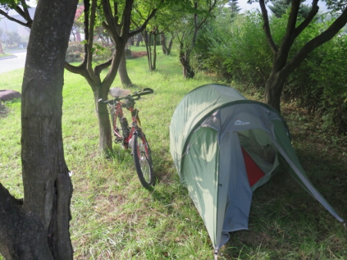 After whizzing down for a while we made it to a town and after looking around for a bit we found some grass under some trees by the side of the road. Normally this would have been a complete no no for me wild camping, as it was fairly visible, by the side of the road and in a town. In Korea though I felt fairly confident we wouldn’t be bothered and this was true and the pitch turned out to be one of the best ones of the trip as the road wasn’t too busy and the trees provided shelter.