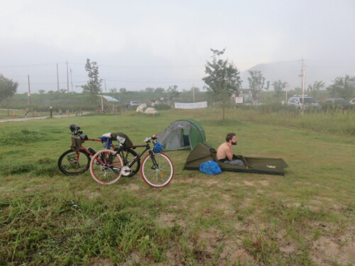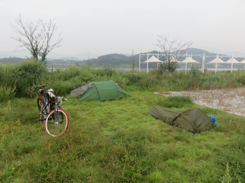 The only problem so far with Korea had been the cost. Whilst not being wildly expensive, after China and Central Asia it was a bit of a shock to the system. This meant I was a little nervous about being able to find somewhere cheap to sleep. I needn’t have worried. The cycle route is a dream for camping and from the sounds of it most of the country is the same. Basically if there was a bit of grass it seemed to be acceptable to camp on it and there were a lot of parks lining the route. The first evening Bart and I came upon what seemed to be a free ad hoc campsite right by the river and after checking with a group of English teachers that it was actually free and we could actually set up anywhere we did. There were a lot of Koreans camping there already and they seemed to take a similar attitude to camping as to cycling: buy all the kit on sale and work out whether you actually need it later.