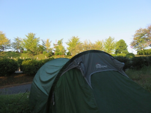 I arrived a bit later than expected in the environs of the city as I’d lost time finding a route I could cycle. Route 2 which I’d been following had turned into a highway and there was no obvious alternative for cyclists. When I’d finally found the right way it was almost dark and I camped on the first bit of grass with a bit of cover that I found. This happened to be on the edge of a cemetery which made me a bit nervous. Not because of ghosts but because I wasn’t sure if there were any taboos in Japan about camping so close to a burial ground.