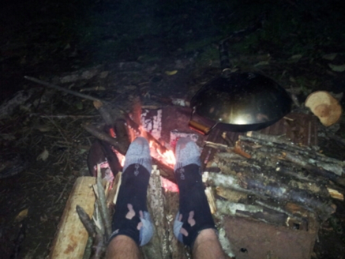 This turned into a very nice evening as we got a fire going – although with a lot of effort in the damp. We almost gave up a few times as nothing would take. In the end it did and Daniel cooked a delicious meal over the blaze in a wok and I got to toast my damp toes.