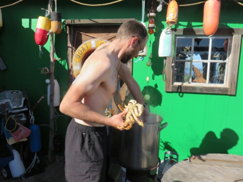It was also fun pulling up the cages to see what we’d get. In the end we came away with six good size crabs. So we headed back in order to cook them on the dock.